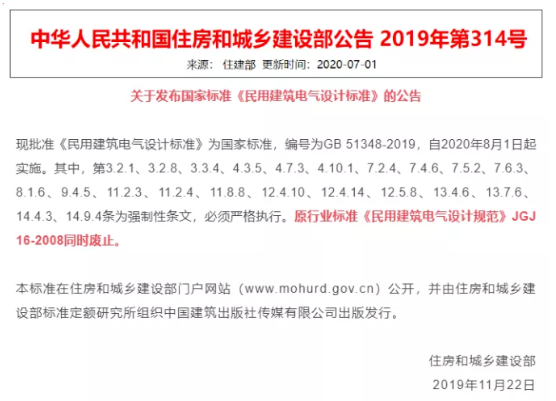 住建部颁布新版国家标准GB51348-2019《民用建筑电气设计标准》取代原JGJ16-2008《......